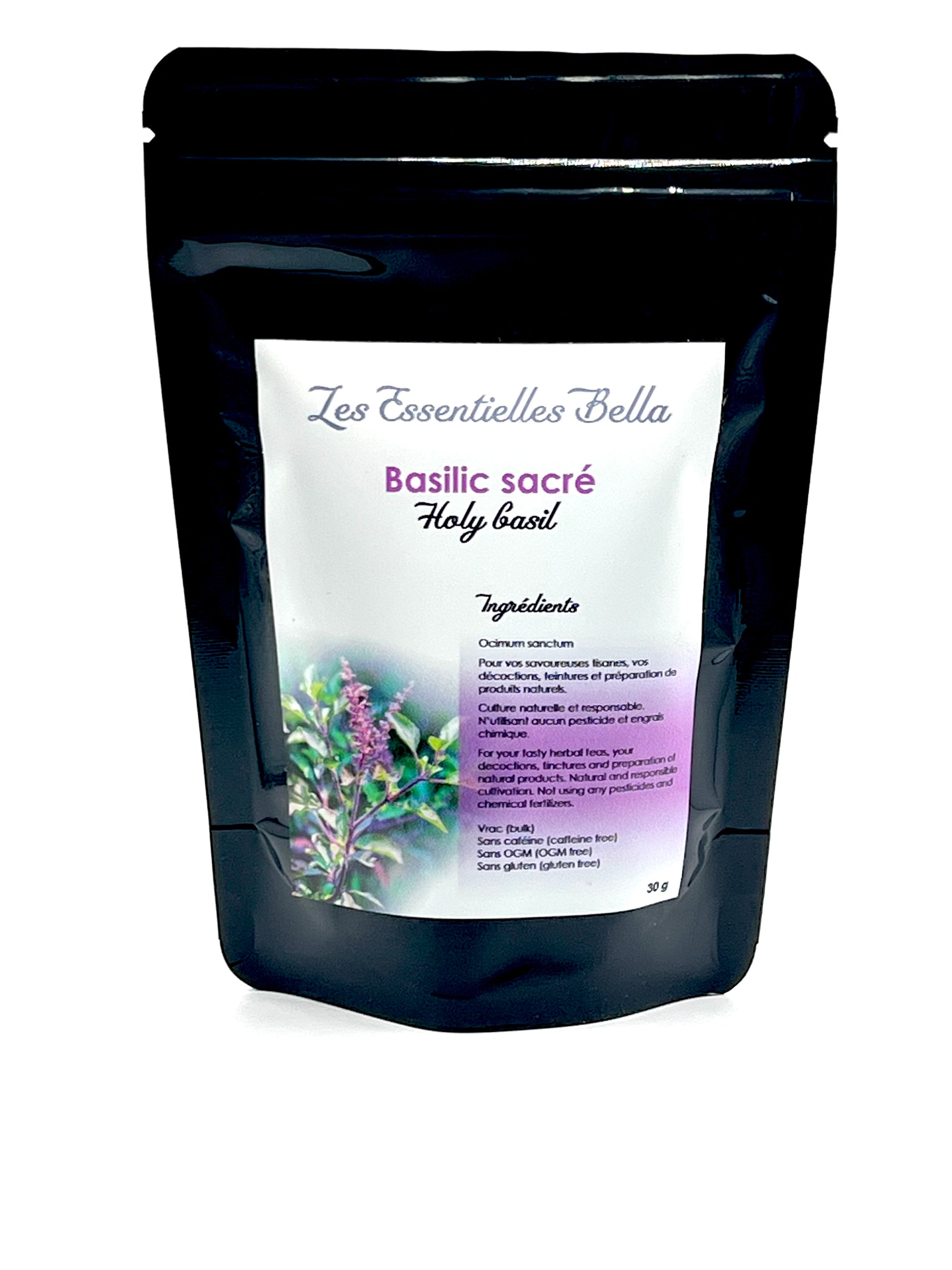 Le basilic sacré est une plante verte, feuillue avec des fleurs violettes appartenant à la famille de la menthe. Le basilic sacré est un arbuste aromatique originaire de l'Inde. Ne confondez pas le basilic sacré avec le basilic doux (aussi appelé basilic thaïlandais) couramment utilisé en cuisine; bien qu'ils soient apparentés, ce sont deux plantes différentes.