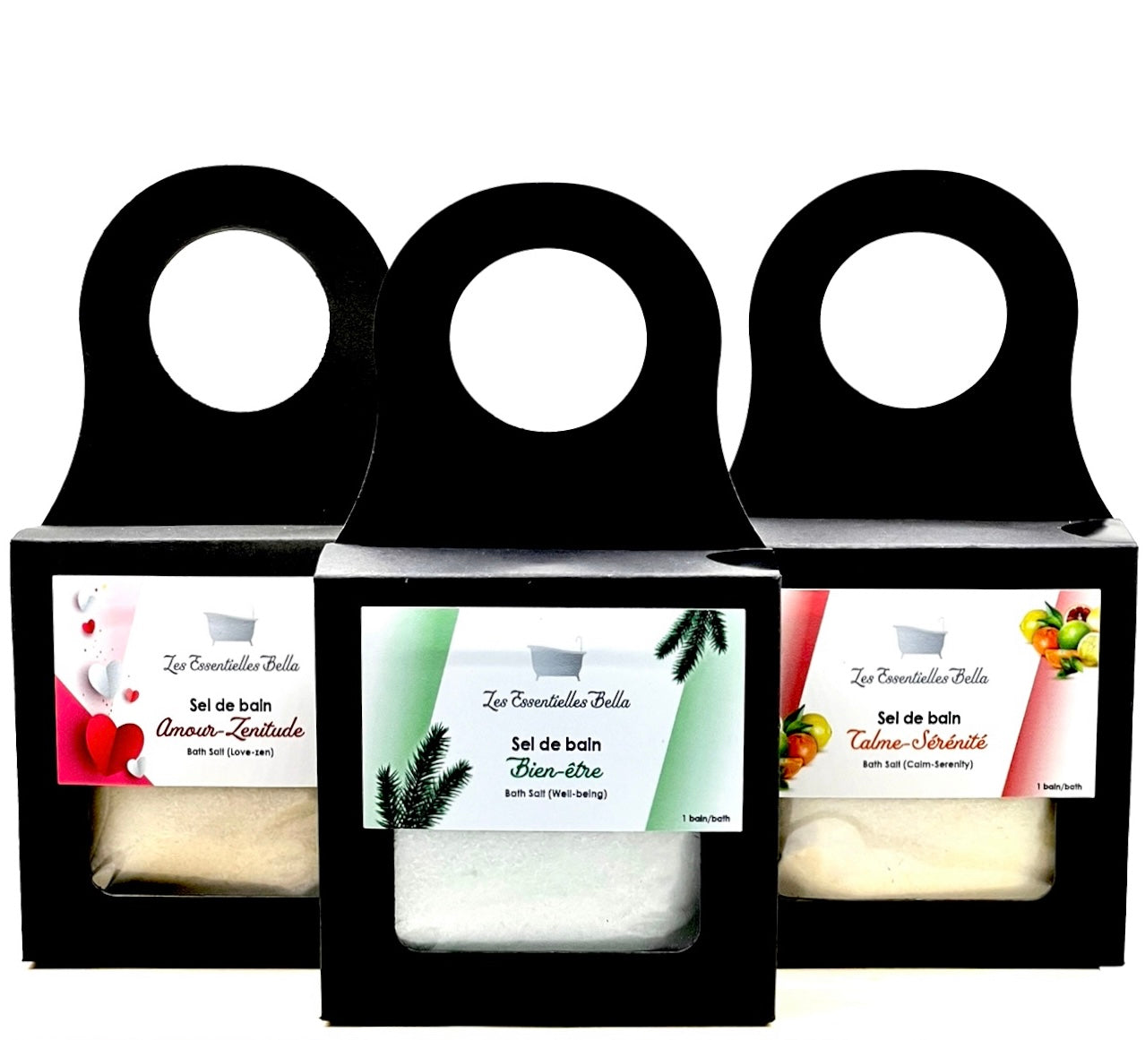 Petit boîtier contenant du sel de bain, qui s’accroche à une bouteille de vin, d’alcool ou de bière.