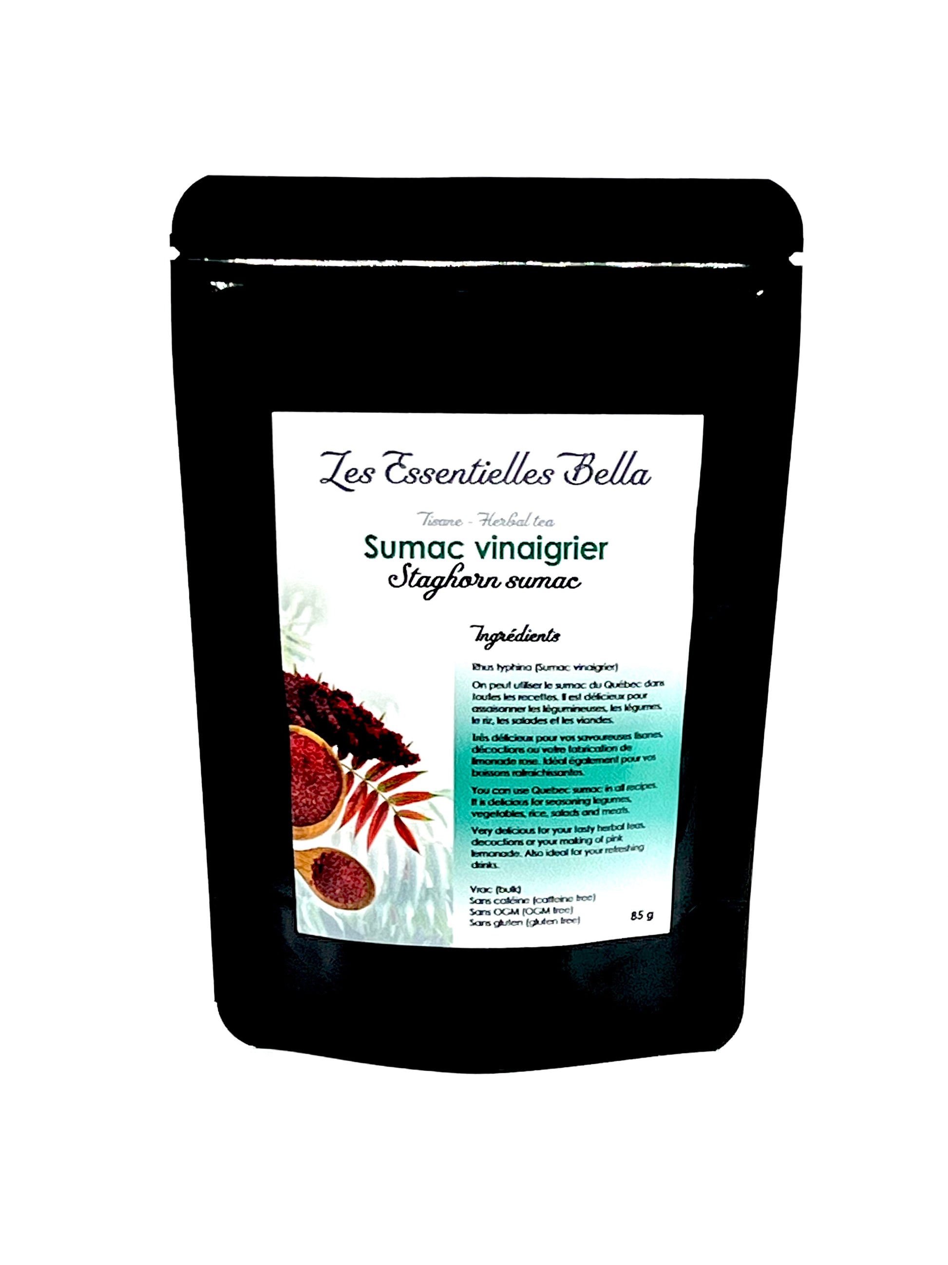 Le sumac de vinaigrier est un arbrisseau pouvant atteindre 6 m de hauteur. Ce sont justement ces fruits que nous récoltons pour être consommés. Ce fruit a un goût fabuleux et de nombreux bienfaits pour la santé. On peut s'en servir en tant qu'épices pour soupoudrer les salades, ajouter à nos trempettes, les grillades, les yogourts, les desserts, les légumineuses, les viandes, etc.
